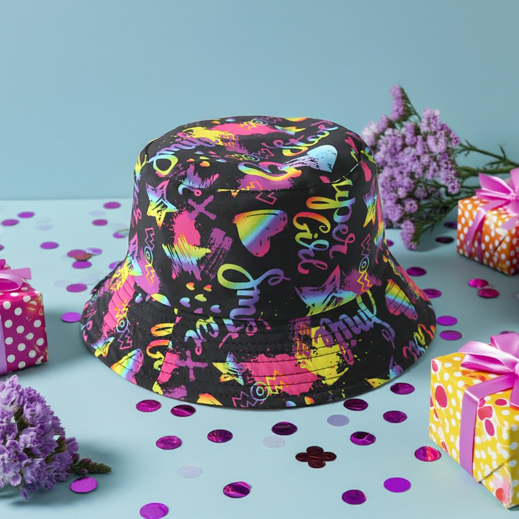 Add a playful touch to your summer look with this rainbow print bucket hat, featuring vibrant heart prints. Made from lightweight polyester, this bucket fits most adults and offers stylish sun protection for everyday wear or travel.